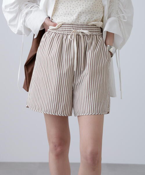 さらっとして肌に張り付かない素材感のショートパンツ。 異ピッチのシャツストライプが爽やかな印象です。裾に付けた共地の華奢なパイピングがアクセント。 短すぎない丈感とウエストはぐるりゴム仕様でストレスフリーなはき心地です。 裏地付きなので安心して着ていただけます。パジャマ感のあるアイテムを街で着るのが今年らしいスタイリングを後押し。 同素材のストライプキャミソール(店舗商品番号131-5210051)を合わせ、リラックス感あふれるヘルシーな着こなしがおすすめです! ※モデルの着用画像の場合、光の当たり具合により、実際の色味と異なって見えることがございます。色味は、商品単体の画像をご参照ください。 商品特性 ■透け感:ややあり ■生地の厚さ:普通 ■裏地:あり ■伸縮性:なし ■光沢:なし ■シルエット:スタンダード --------------------------------------------------- ◆商品のお気に入り登録◆ お気に入りアイテムの値下げ・再入荷・在庫1点などの通知を受け取ることができます。 ◆ブランドのお気に入り登録◆ 新商品や再入荷、セール、クーポン配布などお得な情報を受け取ることができます。 ---------------------------------------------------