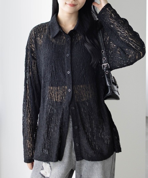 上品な透け感がコーディネートに抜け感をプラス!レース長袖オバーシャツ【デザイン】全体に施された立体感のあるレース生地が印象的な一枚。クラシックなシャツカラーとフロントボタンでどんなスタイルにも馴染むベーシックなシルエットに仕上げました。レースで仕立てたシアーシャツが女性らしさとモード感を両立します。【素材感】耐久性のあるナイロン素材伸縮性:なし/ 透け感: あり/ 裏地:なし 手洗いによる洗濯可 / ドライ・ウェットクリーニング可【コーディネート】白やベージュのシンプルなインナーを選びテーパードパンツ合わせたオフィススタイルやボトムスにゆるめなデニムを合わせたカジュアルスタイルもおすすめです♪【CLEAR BASIC】2025年春から、OL層のお客様向けの着回ししやすい新ブランドです♪【※お取り扱い上のご注意】1:モニター環境等により実際の商品と多少色味が異なって表示される場合がございます。予めご了承下さい。2:屋外で撮影された商品は、天候により多少実際のカラーと異なる場合があります。商品のカラーはトルソー(マネキン)の商品画像をご参照ください。3:濃い色の商品は、お洗濯や摩擦等による移染にご注意ください。4:末永くご愛用頂く為に、アテンションタグ・洗濯ネームを必ずご確認の上、着用又はお取り扱い下さい。5:生産時期により、色、サイズ、デザイン、素材の質感が多少が異なる場合がございます。あらかじめ御了承下さいませ。