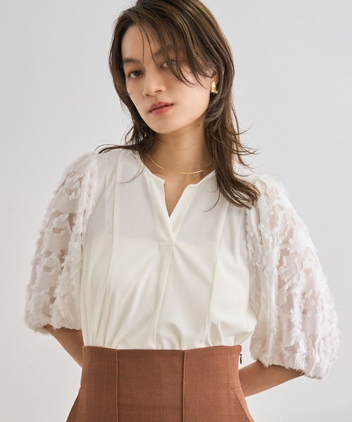 主役級の一枚、ジャガード袖が華やかに映えるきれいめブラウス【デザイン・シルエット】身頃が布帛ライクで、袖に華やかなジャガードを掛け合わせた着映えブラウス。身頃は落ち感のある素材で、着用しやすくドライタッチ。また肌に張り付きにくい素材感。袖はややシアー感のあるカットジャガード素材で、1枚で映えるデザイントップスです。ペプラムのシルエットなので、腰回りやヒップラインをカバーする効果も期待できます。【おすすめのスタイリング】すっきりしたペプラムシルエットで、タイトスカートやワイドパンツとの合わせがおすすめ。落ち感のある素材なので、タックインでもアウトでもスタイリングが決まります。きちんと見えするので、お仕事やオフィスカジュアル、お出かけ時のスタイリングと好相性◎【素材】身頃:ポリエステル素材でしわにもなりにくく、清涼感がある素材。布帛見えするので、きちんと見えを叶えます。袖:リーフ柄のカットジャガード。適度な透け感があります。----------------------------透け感:ホワイトのみややあり裏地:なし伸縮性:身頃はあり光沢感:なし生地の厚さ:薄手ポケット:なし開き方:かぶり洗濯:手洗い可能----------------------------【モデル情報】モデル身長:165/166cm 着用サイズ:F※画像の商品はサンプルです。実際の商品と仕様、加工、サイズが異なる場合がございます。※撮影場所やライティング、お使いのモニター環境によって色の見え方が異なる場合がございます。※商品のカラーは画像の色味をご参照ください。動画は仕様説明のため、色味が実物と異なる場合がございます。