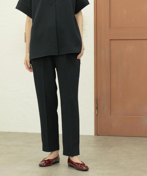 きちんと、楽チン。イージーさと美しさを両立した、美脚見えイージーテーパードパンツ【セットアップ対応可能】【デザイン】・すっきりとしたシルエットで仕立てたイージーテーパードパンツ。・ややゆとりを残した腰回りから、裾にかけてキレイにテーパードさせたシルエットは、スタイリングを問わず様々なスタイルに合わせやすい一本です。・センタープレス入りでよりキレイなラインとクリーンな印象を強調。・ジャストレングスの設定で足元を選ばず、キレイめなシューズはもちろん、スニーカーを合わせるのもおすすめです。・ウエストはゴム仕様でストレッチの効いた素材なので、リラクシーな穿き心地も魅力です。・ドローコード入りでウエスト位置の調整も可能です。※同素材でワイドパンツ(637-63015)もございます。※同素材のデザインブラウス(637-83001)とのセットアップでの着用もおすすめです。【素材】・マットな質感とドライなタッチがポイントの梳毛(そもう)調素材を使用。・程よい厚みのドライな素材感は、シーズンを選ばず着用が可能です。・身体のラインを拾い過ぎず、しっかりストレッチが効いているので着心地も快適です。・クリーンできちんと感がありながら、お手入れがしやすい防シワ機能付き。・マシンウォッシャブルでご家庭でのお洗濯が可能。・イージーケア、アンチピリングでお手入れも簡単です。【仕様】・ポケット数:横×2 後ろ(ダミー)×2・ウエスト総ゴム・裏地なし※こちらの商品はやや透け感があるため、インナーの着用をおすすめします。※照明の関係により、実際よりも色味が違って見える場合があります。また、パソコン・スマートフォンなどの環境により、若干製品と画像のカラーが異なる場合もございます。モデル情報:身長163cm B82 W62 H91 着用サイズ:38(M)店舗へのお問い合わせ商品番号:637-63002●製品寸法:01(トールS):総丈97cm W65cm H99cm 股下67cm 渡り幅31cm 裾幅16cm02(トールM):総丈99cm W68cm H102cm 股下68cm 渡り幅32cm 裾幅17cm03(トールL):総丈101cm W71cm H105cm 股下70cm 渡り幅33cm 裾幅18cm34(SS):総丈93cm W62cm H96cm 股下64cm 渡り幅30cm 裾幅15cm36(S):総丈94cm W65cm H99cm 股下64cm 渡り幅31cm 裾幅16cm38(M):総丈95cm W68cm H102cm 股下65cm 渡り幅32cm 裾幅17cm40(L):総丈98cm W71cm H105cm 股下67cm 渡り幅33cm 裾幅18cm42(LL):総丈98cm W74cm H108cm 股下67cm 渡り幅34cm 裾幅18cm備考: