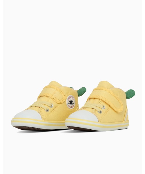 ベビー オールスターのプリントアレンジモデル。 フルーツをモチーフに、イチゴとレモンを踵やアッパーの柄に落とし込んだ可愛らしいデザイン。 ベビーウェアでトレンドのやさしいパステル調の色合いにまとめた一足。 脱ぎ履きしやすいベルトタイプで、しなやかなラバーを採用し足の曲がる位置でしっかり屈曲する足に優しい仕様。 さらに履き口にフォームを追加し、フィット感や足首のサポートを向上。 カラーはイチゴ(ピンク)、レモン(イエロー)の2カラー展開。