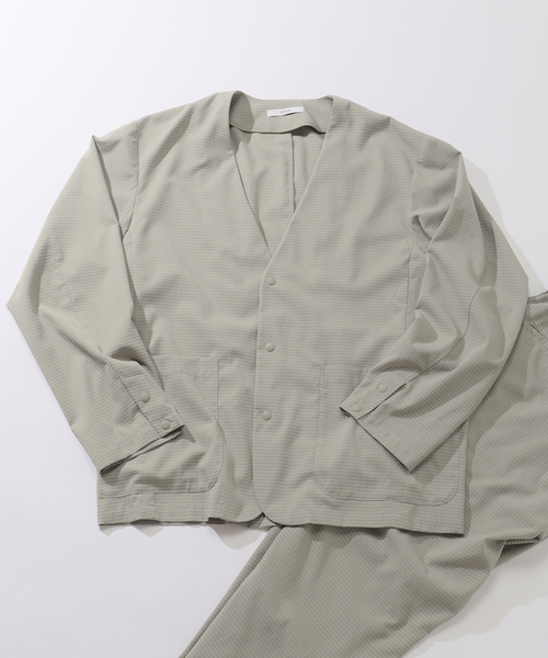 [DRY-STUFF]AIRLY DOTS SUCKER NO-COLLAR JKT 風が抜ける、空気のような軽さ。夏を制する【DRY-STUFF】シリーズの軽量コンフォートジャケット。 夏の快適素材シリーズ『DRY-STUFF』(ドライスタッフ)が初登場! 洗えてキチンと感のあるアイテムが好評頂いている、relumeの『TECHシリーズ』からその理念を凝縮し、デザイン性と機能性を融合させたのが、このノーカラージャケットです。 無数の細かい格子状の穴が開いた特殊なメッシュ生地「AIRLY DOTS(エアリードッツ)」を採用。 風の通り道となり、衣服内に熱がこもるのを防ぎ、通気性を実現します。 さらに、生地表面に凹凸感のある「サッカー仕上げ」を施すことで、肌への接地面を最小化。汗をかいても肌に張り付かず、常にサラサラでドライな極上の着心地をキープします。 この軽量素材は、肩への負担を感じさせないノンストレスな着心地で、長時間の着用や移動の多い日でも疲れ知らず。夏の相棒として、毎日でも袖を通したくなる一着です。 すっきりとした首元を演出するノーカラージャケットデザインは、Tシャツやカットソーの上にラフに羽織るだけで、こなれた印象に。 ジャケットほど堅苦しくなく、カーディガンよりきちんと見える絶妙なバランスが、大人の休日スタイルを格上げします。 またシワになりにくく軽量なので、旅行や出張のお供にも。 もちろん、同素材・シルエット違いのパンツと合わせたセットアップスタイルもおすすめです。 デザイン性を損なわないよう、ポケットにはコンシールファスナーを搭載。 一見するとわからないスマートなルックスながら、スマートフォンや鍵などの貴重品を安心して収納できる実用性も完備しました。カバンを持たないミニマルな外出も、この一着が叶えます。 「AIRLY DOTS(エアリードッツ)」を使ったパンツでのセットアップスタイルもおすすめです。 品番:25030464067010 商品名:【DRY-STUFF】エアリードッツ サッカー イージーパンツ 品番:25030464068010 商品名:【DRY-STUFF】エアリードッツ サッカー ワイド イージーパンツ ********************** 裏地:なし 伸縮性:あり 光沢感:なし 生地の厚さ:薄手 ********************** 【スタッフ着用コメント】 《スタッフH》 身長:170cm/体重:60kg/体型:中肉中背/普段サイズ:M/着用サイズ:L サイズ感:ストレスフリーでややゆったりとしたサイズ感 素材感:通気性がよく、サッカー素材肌当りもいい素材です。 着心地:程よいストレッチ感と収納力もある夏の羽織にピッタリなアイテム。 ********************** 《画像についてのご注意》 ※照明の関係により、実際よりも色味が違って見える場合があります。 またパソコン・スマートフォンなどの環境により、若干製品と画像のカラーが異なる場合もございます。 ※商品の色味は、商品アップ画像をご参照ください。 《商品のお気に入り登録について》 「カートに入れる」または「予約する」右側のハートマークを押していただくと、 再入荷、残り1点、セールなどの通知を受け取ることが出来ます。 本体:洗濯機洗い(ネット使用)