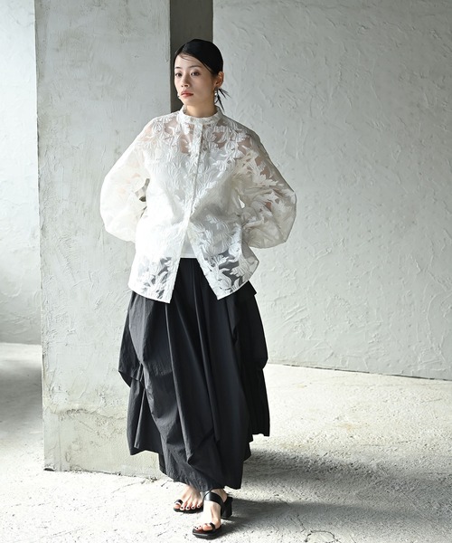 透け感があり、しっかりとした ハリのある生地を使用したシャツです。 ゆったりめのサイズと袖のボリュームで 上品だけどきれい目に振りすぎない 軽い着心地でスタイリングを華やかに 彩ることのできるシャツです。 注意事項 *撮影場所やイメージにより 実際の商品と色味が 若干異なる場合がございます。 商品のお色味は カラーバリエーション画像を ご参照ください。