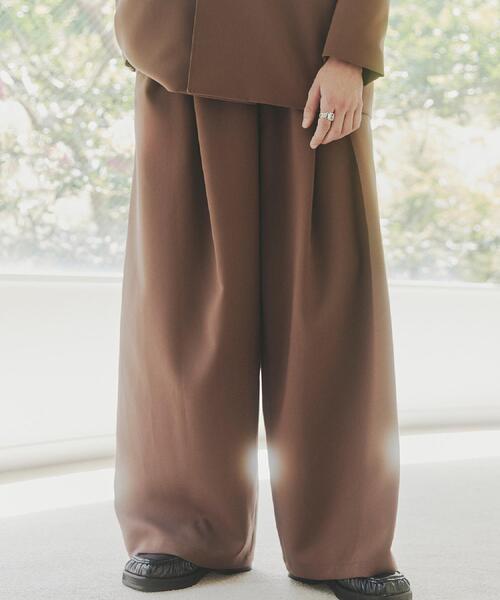 【素材】ポリエステルとレーヨンをかけ合わせたウール調の合成繊維を使用しています。ポリウレタンを少量混合することで生地に反発性が生まれ、程よいハリ感に。滑らかな表面感と程よい光沢感が特徴です。【デザイン】トレンドスタイルを取り入れるのにおススメのバギースラックス。スッキリとした腰回りと太ももから裾へ広がるシルエットと、フロントに大きく入ったタックがポイント。更に後ろ身頃にもカッティングデザインを入れることで、全方向から見てもキマるデザイン性の高い一本です。【仕様】・ポケット数:横×2 後ろ×2・前ファスナー・ウエスト後ろゴム・裏地なし【推奨サイズ】01サイズ(S):160~170cm02サイズ(M):165~175cm03サイズ(L):170~180cm※標準体型を基にした目安になります。- BRAND CONCEPT -時代を超えて支持されるトラディショナルなアイテムをベースに、アソビ心とストリートの自由な発想を取り入れ、日本独自のミックススタイルを提案します。【気になる商品はお気に入り登録をおススメ】▼商品のお気に入り登録完売しているカラーの再入荷通知や、ラスト1点、セールの通知をお知らせいたします。▼ブランドのお気に入り登録新商品や再入荷など、いち早くブランドの情報を受け取ることができます。※照明の関係により、実際よりも色味が違って見える場合があります。また、パソコン・スマートフォンなどの環境により、若干製品と画像のカラーが異なる場合もございます。モデル情報:身長180cm B89 W72 H93 着用サイズ:03(L)店舗へのお問い合わせ商品番号:170-74112●製品寸法:01(S):W70cm H104cm 股下73cm 前股上29cm 渡り幅38cm 裾幅31cm02(M):W74cm H108cm 股下74cm 前股上29cm 渡り幅40cm 裾幅32cm03(L):W78cm H112cm 股下76cm 前股上30cm 渡り幅41cm 裾幅32cm備考: