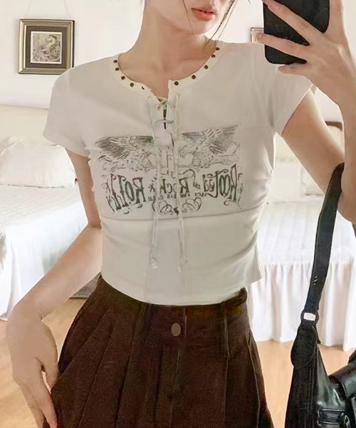 【SpRay テレコイーグルスタッズTシャツ】トレンド感のあるヘルシーな肌みせ&華奢見えが叶うアイテム♪胸元のキーネックにレースアップ、ヘルシーな肌見せできるサイドシャーリング、ヴィンテージライクなイーグルのかすれプリントなどトレンド感詰め込んだのトップス♪細いピッチのテレコ素材はほどよいフィット感と伸縮性ある生地感で着心地も快適◎コンパクトに着たい方やタイトやスリムシルエットのトップス、ちびTをお探しの方にぴったりです!Styling コンパクトなフォルムなのでボトムはボリューム感あるルーズシルエットなパンツでこなれ感漂うカジュアルスタイルや、ふんわりティアードスカートにウエスタンブーツに合わせたアーリースタイルなど幅広いスタイリングを楽しめます♪#レディース#春夏アイテム#ショートT#テレコT#キーネック#レースアップ#かすれプリント#イーグル#ヴィンテージライク#スタイルアップ効果#こなれ感#韓国風ストリート#アーリースタイル【素材感】柔らかく肌触りの良い生地。※詳しいお手入れ方法は商品タグをご参照ください。◆伸縮性有り ◆透け感無し ◆裏地無し 【商品のお気に入り登録】完売カラーの再入荷通知やラスト1点の通知プライスダウンの通知も受け取ることができます。ぜひご登録ください◎【ブランドのお気に入り登録】新商品や再入荷など、いち早く情報を受け取ることが出来ます。※輸送時による、多少の汚れ・シワがある場合がございます。※撮影時のライティング、ご覧になっているモニター・PC環境により実際の商品と色味が異なって見える場合がございます。ご了承の上お買い求め下さい。※着用、お取り扱いの際は、商品に付いている品質表示とアテンションタグを必ずご確認ください。