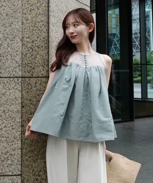 ボディラインを美しく魅せながら、贅沢なボリュームシルエットのフレアブラウス。胸下で高めに切り替え、裾に向かってふんわり広がる美しいシルエットで、肩を直線的にすっきりと仕上げることでコンパクトで華奢な印象に仕上げています。トップス部分は繊細なシアー素材を使用することで全体に軽やかさをプラス。胸元のラインはカーブ線を描くことで、緩やかな曲線が大人っぽい抜け感を演出しています。フレア部分にはハリのあるグログラン素材生地を使用し、贅沢にギャザーを寄せることで高級感のある立体的なボリュームを出しました。デイリーには勿論、特別なシーンにもご着用いただけるブラウスです。洗濯方法:手洗い可