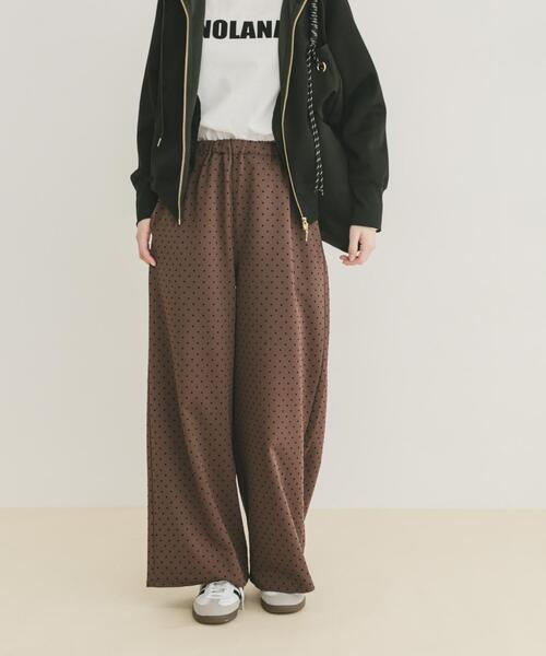 着こなしに奥行きを添える、大人の柄ワイドパンツ。シーズンを重ねてご好評のイージーワイドストレートパンツが、新柄を加えて今年も登場。ウエストはゴム仕様で快適なはき心地ながら、落ち感のある素材と程よいワイドシルエットで、カジュアルにもきれいめにも対応します。新たに加わったドット柄に加え、フラワーモチーフを配したブラウンとグリーンの全3色を展開。シンプルなトップスと合わせるだけで着映えし、毎日の装いに華やかさを添えてくれる一枚です。【2025 Autumn/Winter】【25AW】※この商品はファッション性を重視し、フロッキープリントをしています。フロッキープリントは加工の特性上、永久的なものではありません。着用やクリーニングを繰り返すと、プリント部分が徐々に剥落したり薄くなる場合があります。※ベルトやバッグなどとの強い摩擦が加わると、プリントは剥落したり他のものに色移りすることがあります。※その他お取り扱いに関しましては、商品に付属のアテンションタグをご覧ください。※商品画像は、光の当たり具合やパソコンなどの閲覧環境により、実際の色味と異なって見える場合がございます。予めご了承ください。※商品の色味の目安は、商品単体の画像をご参照ください。▼お気に入り登録のおすすめ▼お気に入り登録商品は、マイページにて現在の価格情報や在庫状況の確認が可能です。 お買い物リストの管理に是非ご利用ください。素材感透け感 : なし伸縮性 : なし裏地 : なし光沢 : なしポケット : ありFREE
