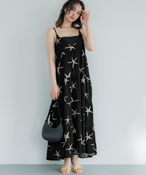 ヒトデ柄のリゾート風ティアードワンピース \ヒトデシリーズはこちら/ ・85305392(ZOZO)26-231205004-13(店舗) →レーヨンヒトデパンツ ・66016044(ZOZO)26-220321301-13(店舗) →キッズ 親子お揃いレーヨンヒトデ柄シャツ ・66016095(ZOZO)26-220321302-13(店舗) →キッズ 親子お揃いレーヨンヒトデ柄パンツ ・66016061(ZOZO)26-220321204-13(店舗) →キッズ 親子お揃いレーヨンヒトデ柄ワンピース ■デザイン・シルエット 黒地にヒトデ柄をあしらった、ユニークながらも派手すぎない絶妙なバランスのデザイン。 Vネックがデコルテをすっきり見せ、抜け感のある印象に。 ふんわりと広がるティアードシルエットで、女性らしさと動きのある表情を演出します。 肩紐は長さ調節が可能で、体型やスタイリングに合わせてアレンジが楽しめるのも嬉しいポイント。 ■素材 ・さらりとした肌触りで夏にぴったりの軽やかな素材感 ・ふんわりと広がる落ち感のある生地で、ボリューム感がありながらもすっきり見え ■コーディネート サンダルを合わせてリゾート感たっぷりに着こなすのはもちろん、 インナーにTシャツを重ねればタウンユースにも◎ カーディガンを羽織って季節の変わり目にも対応できる万能ワンピです。 伸縮性:なし 透け感:ややあり 裏地:なし ポケット:なし 生地感:柔らかい薄手生地 注意点:素材の特性上、縮みやすいのでご了承下さい。 お洗濯方法によっては縮みや色あせの可能性あり。乾燥機等のご使用はお控え下さい。 ▼生地や素材の性質により2cm前後サイズ誤差が出る場合がございます。 ▼モデル着用写真は撮影環境により、多少実際のカラーと異なる場合がございます。 ▼色落ちの恐れがありますので、他のものと分けて洗って下さい。 ▼当商品は機械による生産の過程上、『生地を織る際の糸の継ぎ目』や多少の『ほつれ』、繊維の『混紡』、形やサイズに多少の『誤差』が生じる場合がございます。 ワンピース ロング キャミワンピ ティアード ティアードワンピース 重ね着 ロング丈 肩紐調節可 柄 カジュアル シンプル 25ss コカ COCA coca COCA coca