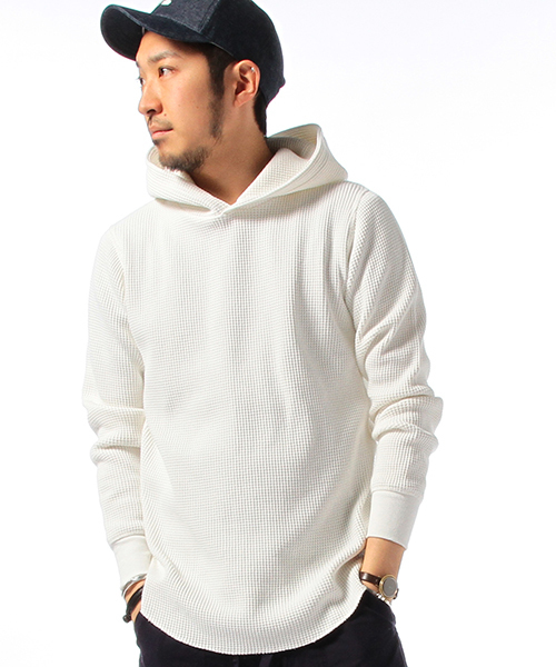 サーマル+フードの新定番 定番のサーマルTにフードをつける事で、レイヤードスタイルの新しいカタチを表現する事が可能に。シャープなシルエットなので、1枚での着用は勿論、Tシャツとの重ね着にも重宝します。 厚みのある素材感が重厚感を演出 厚手のサーマルをボディに使用し、通常のスウェットパーカ以上に、生地の構成が特殊で空気(通気)を入れることで、快適な着心地を実現しています。また、フード部分も生地が2重になっている為、成形性が保たれ、アウターから出した時、またTシャツと重ね着した時のフードの成形性が保たれ、コーディネートのワンポイントになります。