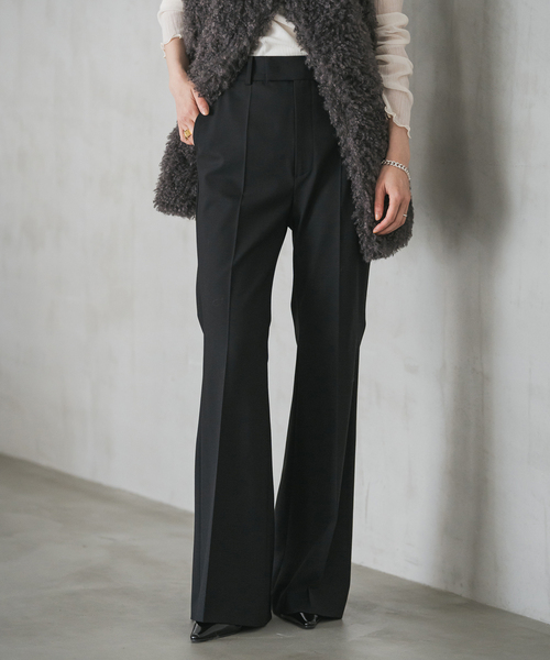 美脚に導く大人のフレアパンツが新登場! さらりとしたタッチながらポリウレタン混の抜群のストレッチ性ともっちりした高級感のあるウールの質感を併せ持ち、秋口から大活躍間違いなしの素材のパンツ。 太もも部分はすっきり、裾に向かってフレアの美脚シルエットは、普段のパンツをこちらに差し替えるだけで旬顔に仕上げてくれます。 トップスを選ばないシンプルさも魅力的ですが、着丈の長いルーズなトップスとも好相性なシルエットになるようにこだわった一品。 ********************** 透け感:なし 裏地:なし 伸縮性:あり 光沢感:なし 生地の厚さ:普通 ********************** 【スタッフ着用コメント】 年齢20代/身長:155cm/体型:やや細身/普段サイズ: 34~36 /着用サイズ:38 サイズ感:もも周りはすっきりとしていて、裾に向かってゆとりが出るサイジング。 膝上あたりが一番細いので、ももに合わせたサイズ選びがおすすめです。 着丈は長く、5cmのヒールを穿いても下に付くくらいの長さ。 素材感: ウール混のやや暖かみのある素材。 着心地:フレアシルエットが着こなしに新鮮さを出してくれます。 ウールが入っているので、冬も暖かく穿けそうです。 ********************** ※ブラック(001)のみ 色落ち:着用中の摩擦や汗、水などで濡れたことによる他のものへの色移りにご注意ください。 ※キャメル(025)のみ 色あせ:日光や蛍光灯の光に弱く、色あせ(変色)しやすい性質があるので、長時間の直射日光は避けてください。 ※取り扱いについては、商品についている品質表示でご確認ください。 ※こちらの商品は、NOBLEでの取り扱いになります。 直接店舗へお問い合わせの際はNOBLE店舗へお願い致します。 ※照明の関係により、実際よりも色味が違って見える場合があります。 またパソコン・スマートフォンなどの環境により、若干製品と画像のカラーが異なる場合もございます。 ※商品の色味は、商品アップ画像をご参照ください。 ブラック着用スタッフ身長:163cm 着用サイズ:38 キャメル着用スタッフ身長:164cm 着用サイズ:38 モデルサイズ:身長:1633cm 着用サイズ:38 本体:手洗い可能