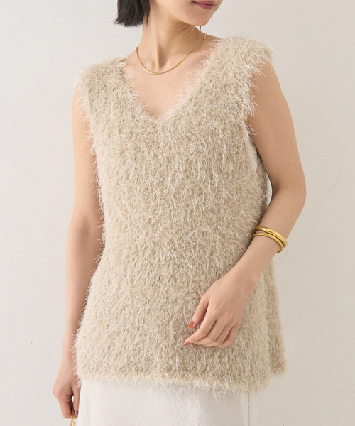 2種類の異なるフェザーヤーン素材を贅沢に組み合わせた、存在感あふれるコンビフェザーニットベスト。光沢感や糸の形状が異なるフェザーヤーンを引きそろえることで、豊かな表情と奥行き感を実現しました。やわらかな風合いとふんわりとした質感が魅力で、トレンド感と着心地の良さを両立。軽やかで通気性のある天竺編みを採用し、シーズンレスに着用可能。ニット特有の柔らかさと程よいフィット感が、インナーとのレイヤードにも最適です。シャツやワンピースと合わせたスタイリングはもちろん、カジュアルからきれいめまで幅広いコーディネートに対応。秋冬の重ね着にも、晩夏には1枚でも着映える一枚です。【注意事項】※商品画像は、光の当たり具合やパソコンなどの閲覧環境により、実際の色味と異なって見える場合がございます。あらかじめご了承ください。※画像の商品はサンプルです。実際の商品と仕様、加工が若干異なる場合があります。※サイズ表記はあくまで目安となります。※その他の予約商品、通常商品との同時決済はできません。※入荷状況により、お届け予定が前後する場合があります。※お客様への発送が店頭販売より遅れる場合もあります。※追加生産商品は、一部の店舗、通販で販売中の場合がございます。予めご了承下さい。※商品を使用前に、タグ等に記載されている「取り扱い上の注意書き」「洗濯表示」を必ずご確認ください。※商品に不良が無い場合、包装紙および箱の彼損がございましても発送いたします。あらかじめご了承ください。