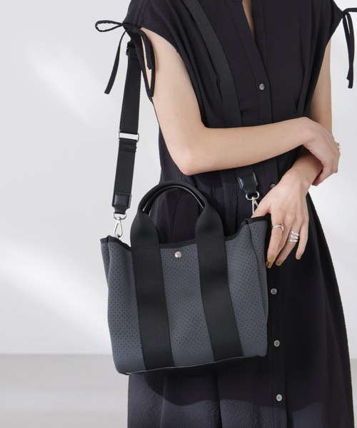 【2025 AW】 NANO universe(ナノ・ユニバース)『荷物を取り出しやすいポケット付き!』これから暑くなる季節に必需品となる水筒や日傘を立てられるポケット付きのトートバッグ。必要な物がすぐにサッと取り出せるような内側仕様で、オフィススタイルはもちろん、マザーニーズとしても最適なアイテムです。■デザイン・汚れが付きにくいのも特徴のトートバッグ・キレイすぎず、カジュアルすぎず取り入れやすいいルックス・収納◎な大きな仕切り2つ付き・便利なショルダーストラップも付きハンズフリーで持てるのもポイント・ON/OFF問わずデイリー使いできる万能アイテム※伸縮性のある柔らかい生地にパンチングを施しているので荷物をたくさん入れると穴の大きさが変化します。重たいもの(ペットボトルを何本も入れるなど)を長時間入れて持ち歩くと破損の可能性がございます。予めご了承下さい。■素材・スポーティーな印象のウェットスーツのような素材を使用・発泡性の素材なので柔軟性があり、クッション性が高いことが特徴・ハンドル部分は光沢感のあるテープと合皮を使用■カラー展開・洋服に合わせやすいベーシックなブラックとグレーの2色展開■コーディネート・お仕事用はもちろん、公園やレジャーシーンにもおすすめ■サイズ感・必需品(水筒や日傘)を立てて収納できるサイズ感■取扱方法この商品は摩擦や水濡れにより色落ちすることがあります。雨天でのご使用や薄い色の衣類を着用の際は特にご注意ください。また他の製品からの色落ち、移行等の影響にもご注意ください。この商品は仕立て素材がデリケートなため破損の恐れがあります。お取扱いにはご注意ください。この商品は洗濯できません。マグネットを使用している商品は、カード類に影響を及ぼす場合がありますのでご注意ください。※サンプルにて撮影、採寸を行う為、実際にお届けする商品と仕様やサイズが異なる場合がございます。予約時は生産の都合上、お届け予定時期が前後する場合もございますので、予めご了承下さい。※光の当たり具合や撮影環境により色味が異なる場合がございます。正しい色味はスタジオ画像の色味をご参照ください。▼商品のお気に入り登録お気に入りアイテムの再入荷や残り1点の通知を受け取ることができます。▼ブランドのお気に入り登録新作アイテムの入荷や人気アイテムの再入荷、タイムセールやクーポンなど、いち早くブランドのお得な情報を受け取ることができます。