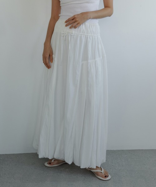 空気を纏うような軽やかさとディティールにこだわったバルーンスカート。たっぷりと贅沢に生地を使って生み出すボリュームシルエットが歩くたびにふんわりと揺れ、抜け感あるエフォートレスなムードを演出します。ウエストには2段にリボンをあしらい、サイズ調節が可能なのはもちろん、トップスをインした際もスタイリングのアクセントに。シンプルな中にもセンスが光る一着。日常に優しく溶け込みながら装いにさりげない個性を添えてくれます。どんなコーデにも馴染むブラックとホワイトの2色展開。夏のサンダルスタイルにも映える一枚です。