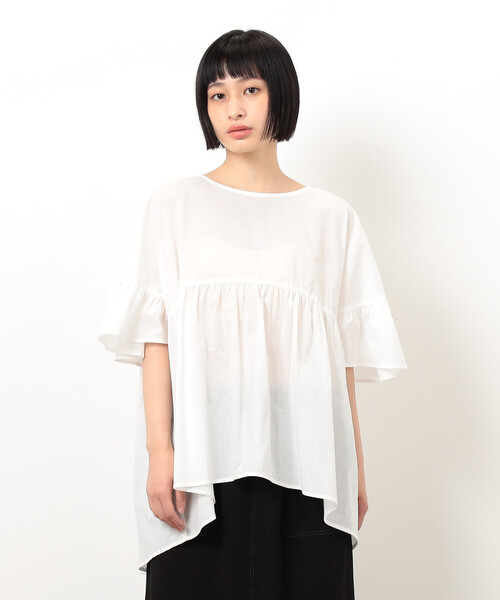 ◆ONIGIRI(おにぎり)のシアーチュニックブラウス◆ 《デザイン》 たっぷり分量を取った、ふんわりギャザーのチュニックブラウスです。 とても軽い素材なので分量があっても楽ちんです。 胸下に切替えを入れる事で裾に向かってふわっと広がり、 ウエストやヒップもカバーしてくれます。 センターバックの二箇所のリボンがデザインポイントで、 とても女性らしい印象です。 ゆったりサイズでふんわりした袖は、 二の腕までカバーしてくれる優れ物です。 着丈に前後差を付けてボトムとのバランスが取りやすいデザインです。 暑い季節に向けて1枚でサマになるブラウスです。 左脇に、さりげなく付けた赤ピスネームがワンポイントになっています。 《素材》 02:オフホワイトカラーはコットン100%の薄いボイル素材です。 ソフトでパリっとした素材で涼しげな素材で、シルエットが綺麗にでます。 09:ネイビーは薄いシア―デニムです。こちらもコットン100%でインディゴ染めで、 バイオウォッシュ加工の製品洗いで、デニムのアタリをさりげなくつけています。 洗うことでとてもソフトな風合いになり肌触りがとても良いです。 09:ネイビーは、洗うたびに少しづつ色落ちして よりナチュラルな素材になっていきます。 …………………… 透け感 : やや透けあり 厚さ:薄い 伸縮性:なし 光沢感:なし 裏地:なし ポケット:なし 洗濯方法:洗濯機洗い可 ………………… ※画像の商品はサンプルとなりますので実際の商品と仕様、加工、サイズが若干異なる場合がございます。 ※こちらの商品はFIVE FOXes独自の採寸方法となっています。 本サイトのサイズガイドと採寸方法が異なる場合がありますのでご了承ください。