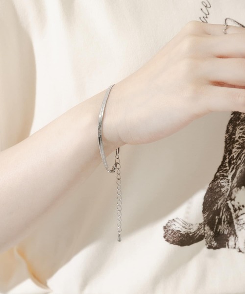 【手元に輝き与える繊細スネークチェーン】●なめらかなスネークチェーン●手元に上品な輝きをプラス●肌に優しく錆びにくいサージカルステンレス素材光を受けてさりげなく輝く、なめらかなスネークチェーンブレスレット。派手になりすぎず、手元に上品な存在感を与えてくれます。シンプルなデザインなので重ね付けもお勧めです。腐食に強く錆びにくいサージカルステンレスを採用した、金属アレルギーにも対応したアクセサリーです。【2025 Autumn/Winter】【25AW】【サージカルステンレスとは・・】・通常のステンレス材よりも、より腐食に強く錆びにくい。・医療器具にも使用されており、金属アレルギーに対応した素材。・お風呂などの水に触れるシーンで付けっぱなしにしても、錆びたり変色したりしにくい。※アレルギーの原因はさまざまです。すべての方に起きないことをお約束するものではありませんので、予めご了承くださいませ。また、症状が出た場合は直ちに使用をお控えください。※アレルギー体質の方や体調が低下している方など、かぶれることがありますので十分にご注意ください。※サージカルステンレスは、腐食に強く錆びにくい特徴がございますが、製品状態を永久保証するものではございません。使用状況によって劣化は異なりますので、ご了承ください。※その他お取り扱いに関しましては、商品に付属のアテンションタグをご覧ください。総重量 : 約3g※商品画像は、光の当たり具合やパソコンなどの閲覧環境により、実際の色味と異なって見える場合がございます。予めご了承ください。※商品の色味の目安は、商品単体の画像をご参照ください。▼お気に入り登録のおすすめ▼お気に入り登録商品は、マイページにて現在の価格情報や在庫状況の確認が可能です。お買い物リストの管理に是非ご利用ください。