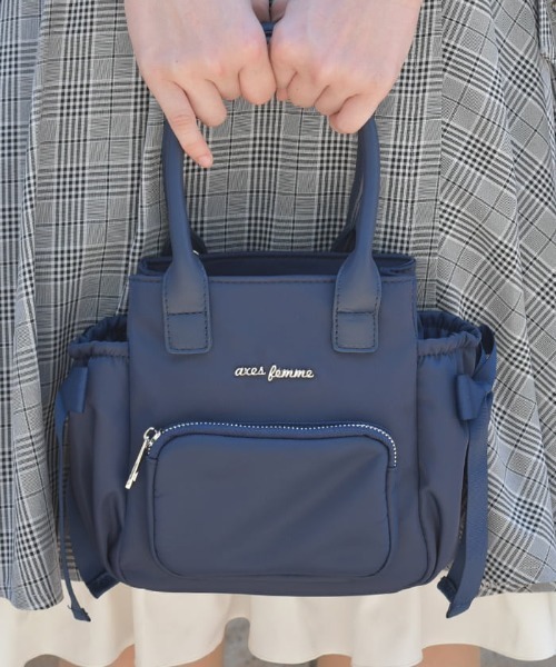 【アイテム説明】デイリーにもレジャーにも◎撥水仕様が嬉しいリボンデザインバッグ【商品紹介】リボンデザインが華やかな撥水仕様のポシェットです。【デザイン】サイドを飾るリボンが目を惹くフェミニンなデザイン。ころんとしたフォルムが可愛い、小ぶりなサイズです。両サイド・フロントのポケットは、すぐ取り出したい小物収納などにおすすめ。中は内ポケットが充実した仕切り仕様になっています。ファスナー付きのスペースもあるので、仕分け収納に便利です。ボディに使用しているナイロン生地は軽くて丈夫なだけではなく、程よい光沢があり滑らかな肌触りの素材なので、キレイめな印象に。撥水加工を施しているので、雨の日のお出かけも安心です。ショルダーベルトには合皮を使用し、丈夫で持ちやすい仕様に仕上げています。ベルトを外してハンドバッグとしても使用でき、ちょっとしたお出かけにも便利◎同じデザインシリーズとして、リボン付撥水ナイロントート(BL614X31)リボン撥水ナイロンショルダー(BL613X33)もございます。お好みやシーンに合わせて、お気に入りを見つけてください♪※防水の構造ではございませんので、強い雨の中で使用される際はご注意ください。▽ axes femme * アクシーズファム【Concept】axes femmeのお洋服であなたのライフスタイルにほんの少しだけ彩る花が咲きますように。ブランドを通して、彩る花たちが、人と人、お客様や作り手たちの想いが世界中に繋がっていきますように。ベル・エポック(フランスの古き良き時代)にパリジェンヌたちが愛したファッションや文化にルーツをおき、独自のフェミニンスタイルを楽しむブランド**********************.。.: お気に入り登録のおすすめ :.。.∇気になるアイテムを登録∇ハートをクリックしてお気に入りに登録すると完売カラーの再入荷やラスト1点の通知、セールの通知を受けとることができます。∇ブランドを登録∇新商品や再入荷、セール通知など、いち早くブランドの情報を受けとることができます。是非ご利用頂き、お買い物をお楽しみ下さい。.。.: 商品について :.。.・サイト上のカラー名と、お届け商品に記載されているカラー名が異なる場合がございます。・商品の色味は、撮影場所や光のあたり具合、お客様のお使いのPCのモニター環境などにより色味が違って見える場合がございます。予めご了承の上ご注文下さい。.。.: 返品・キャンセルについて :.。.・着用、洗濯後の返品は致かねます。・商品到着後、着用前に商品を確認して頂きますようお願い致します。