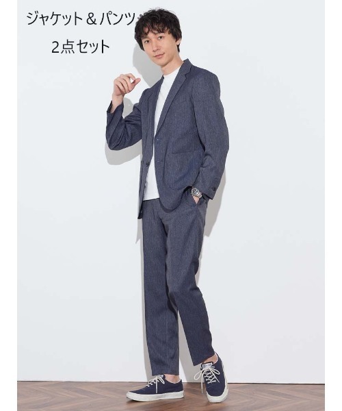 【洗える・伸びる・軽い】ライトセットアップシリーズ。“ビジネスもオフも、一着でスマートに。”ハリ感のあるデニムのような生地をセットアップに落とし込み、ビジネスシーンにお洒落をプラスします。ジャケットとパンツのセットアップで、着るだけで整うシルエット。洗濯機対応・ストレッチ素材で、日常使いに最適です。Tシャツやポロシャツ、ニットをインナーに入れてオフィスカジュアルに着こなして抜け感のある印象に。もちろんネクタイでタイドアップもOK!パッチポケットでカジュアル感をプラス。○おすすめポイント・ジャケットとパンツが上下セットになったハイコスパ商品・ご自宅の洗濯機で洗えるウォッシャブル仕様・ストレッチが効いている・軽い素材※こちらは、元々裾が仕上がっている商品です。◆モデルサイズ:身長178cm胸囲88cmウエスト70cmヒップ86cm◆着用サイズ:L◆モデルサイズ:身長178cm 胸囲85cm ウエスト70cm ヒップ88cm◆着用サイズ:L機能【上下ウォッシャブル】上下セットでコーディネートが簡単に決まるアイテム。シンプルでスタイリッシュな印象を与えます。【ストレッチ】ストレッチ素材で動きやすく、快適な着心地を提供。アクティブなシーンでもストレスフリーで着用できます。【ウエストゴム】ウエストゴムが入っており、体にフィットして快適な着用感。ウエストの調整ができるため、動きやすさも抜群です。【注意事項】※使用前に、タグ等に記載されている「取り扱い上の注意書き」、「洗濯表示」を必ずご確認ください。※商品画像は、光の当たり具合やパソコンなどの閲覧環境により、実際の色味と異なって見える場合がございます。 あらかじめご了承ください。【商品のお気に入り登録がおすすめです】お気に入り登録した商品は、最後の1点の通知、完売商品の再入荷、お得なお値下げ時にお知らせします。【Perfect Suit FActory/P.S.FAのお気に入り登録がおすすめです】PSFA新商品発売、再入荷や、セール情報など、お得な情報を受け取ることができます。