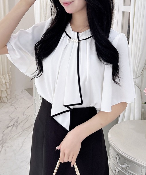 【1枚できちんと着映えるパールピン付きブラウス】 ▼Design 落ち感のあるキレイなシルエットでオンオフ問わずに着まわせるブラウス。 ネックにあしらったボウタイ&パールビジューのピンで上品な印象に。 首元に入れたタックから流れるようなドレープが表情をプラスしてくれます。 ひらりとしたフレアスリーブが二の腕をすっきり見せてくれるのも◎。 程よい裾丈はトップスインスタイルもすっきりキマります。 ▼Styling キレイめなナロースカートやパンツを合わせてオフィスカジュアルにも◎ ・パールピン取り外し不可 【以下チャコールグレー/オフホワイト参考。カラーにより多少の誤差あり】 ・透け感:透けない ・伸縮性:なし ・生地の厚さ:普通 ・裏地:なし ▼Recommend ・きちんとブラウス ・パールアクセ ・夏ブラウス ・通勤 ・オフィスカジュアル ・お呼ばれ