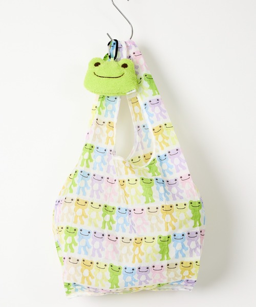 【 かえるのピクルス / pickles the frog 】フェイスぬいぐるみエコバッグ ぬいぐるみに収納されたエコバッグ 従来のぬいぐるみエコバッグより、バッグの大きさが大きくなりました! 肩掛けにもできるサイズ感でより便利に。 【 かえるのピクルス / pickles the frog 】 かえるのピクルスこと、pickles the frogは1994年に「ぬいぐるみも雑貨のようにオシャレに」をコンセプトに、 オリジナル生地を使用した”スパイスミックスシリーズ”のぬいぐるみとして誕生しました。 スパイスミックスとは、1993年に雑貨系ぬいぐるみとしてクマ、イヌからスタートしたぬいぐるみのシリーズです。 シリーズの為に開発したクリクリの生地はアクリルの糸をカールさせてからミックスして織ったもので、 その生地の特徴から『スパイスミックスシリーズ』というネーミングになりました。 普通のぬいぐるみの毛の感じをあえて出さなかったため、ぬいぐるみ屋さんだけでなく、沢山の雑貨屋さんにもおいて頂けるようになりました。 2017年には初めての絵本を出版、2020年にはアニメが初放映されました。 今後もいろいろな媒体、場面でピクルスが登場予定です♪