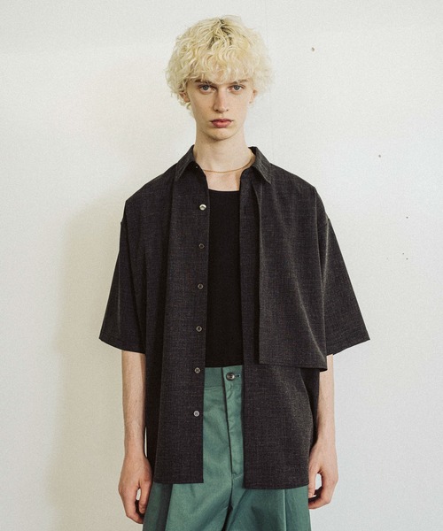 ーーー シルバーボタンを付けたフラシデザインのメランジシャツ ーーー DESIGN 第二ボタンだけ他のボタンと異なり、オリジナルで作成したシルバーボタンを付け、ワンポイントに。 前立ては比翼仕立てで他のボタンは隠れる仕様に対し、シルバーボタンだけあえて見える仕様することでより映えるデザインに。 フロント左側は生地を2枚重ねたフラシデザインにし、動きのあるデザインをプラス。他のシャツと差別化できます。 身幅をやや細くし、スッキリ見えるシルエットに。背中にタックを入れて、シルエットのバランスをとり、より上品な印象に仕上げました。 MATERIAL 立体感のある表面感が特徴なメランジ生地で無地でも奥行きが出て、上品な印象になります。 厚さを抑え、軽さを出して夏も快適に着用できます。 素材はポリエステルで使用しており軽く、丈夫なのでお手入れもしやすいのもポイントです。