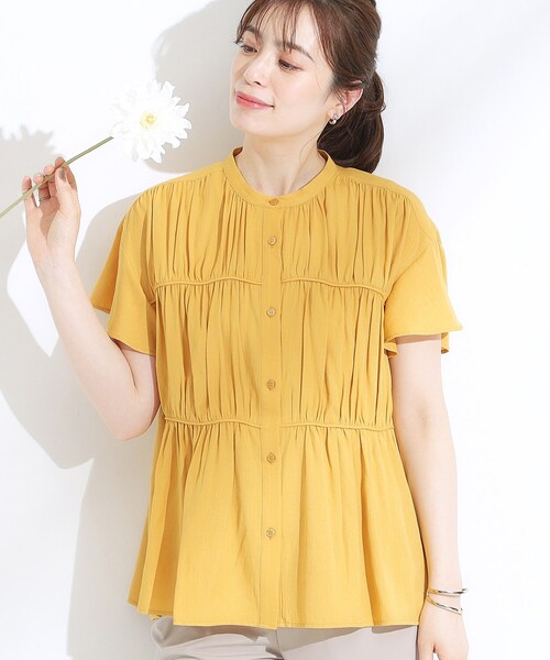 【デザイン】ギャザーがポイントのデザインブラウス。とろみのありながら、さらりとしたスラブ素材が夏にぴったりの1枚です。3段のティアード風のデザインが今年らしくサマになります。【スタイリング】1枚で華やかな印象になるので無地のボトムス合わせでもコーデが完成します。ギャザーが入ったふわりとしたシルエットなので、前を閉めたインしないスタイリングもバランス良く着ていただけます。羽織りとして合わせればギャザーデザインがアクセントなり、シンプルコーデも華やか見えにアップデートしてくれます。イージーパンツやワイドパンツと合わせた大人カジュアルなコーデや、ナロースカートなどとのメリハリのあるスタイリングがおすすめです。ベーシックカラーはオフィススタイルにもぴったりです。【素材】スラブ素材のとろみがある素材を使用しています。※洗濯機可。※透け感あり。※照明の関係により、実際よりも色味が違って見える場合があります。また、パソコン・スマートフォンなどの環境により、若干製品と画像のカラーが異なる場合もございます。モデル情報:身長165cm B82 W60 H88 着用サイズ:02(M)店舗へのお問い合わせ商品番号:741-83009●製品寸法:01(S):着丈61cm B100cm 袖丈12cm 肩幅48cm02(M):着丈62cm B102cm 袖丈12cm 肩幅49cm03(L):着丈63cm B104cm 袖丈13cm 肩幅50cm04(LL):着丈64cm B106cm 袖丈13cm 肩幅51cm備考: