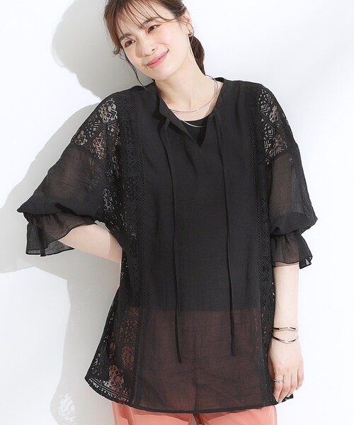 【デザイン】 レースをサイドにあしらったデザインブラウスです。 ブラウス丈とチュニック丈で着丈をお選びいただけるので、 自分のスタイルや体型にぴったり合ったフィット感を楽しむことができます。 柔らかな素材感とフロントのリボン、レースのデザインが女性らしさのある印象に。 カジュアルなシーンからきれいめなシーンまで幅広く着用いただけます。 【スタイリング】 テーパードパンツやタイトスカートと合わせることで大人カジュアルなスタイルになりおすすめです。 ワイドパンツとの着こなしも抜け感あるスタイルに。 また、デニムやカジュアルパンツと組み合わせることで、 リラクシーで抜け感あるスタイルが叶います。 シンプルなアクセサリーやヒールの靴を合わせることで、 より華やかなスタイルを楽しんでいただけます。 【素材】 身頃は柔らかなボイル素材。 サイドにはレースを施しています。 ※照明の関係により、実際よりも色味が違って見える場合があります。また、パソコン・スマートフォンなどの環境により、若干製品と画像のカラーが異なる場合もございます。 #CutieBlonde#Cutie#cutieblonde#cutie#キューティブロンド#キューティ モデル情報:身長165cm B82 W60 H88 着用サイズ:00(FREE) 店舗へのお問い合わせ商品番号:256-83007 ●製品寸法: 00(FREE):着丈71cm B112cm 袖丈34cm 肩幅62cm 11(ショート丈):着丈61cm B112cm 袖丈34cm 肩幅63cm 備考: