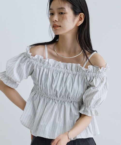 Design Point 遊び心満載のデザインが魅力のシャーリングブラウス。 フリルたっぷりのオフショルダーがモードにフェミニンさを引き立て、シャーリングディテールが動きのあるシルエットを演出します。 Styling Point 落ち感のあるワイドパンツやタイトスカートと組み合わせてバランス感を楽しんで。 一枚で映えるので、シンプルなアクセサリー使いでクールさを演出するのもオススメです。 Fabric Point 軽やかでほどよいハリ感のある素材を使用。 柔らかすぎず、たっぷりのシャーリングが引き立つシャツ地で、季節を問わず幅広く活躍します。 モデル身長:170cm 着用サイズ:38(M) ※照明の関係により、実際よりも色味が違って見える場合があります。また、パソコン・スマートフォンなどの環境により、若干製品と画像のカラーが異なる場合もございます。 店舗へのお問い合わせ商品番号:523-82050 ●製品寸法: 38(M):着丈42cm B84cm 袖丈27cm 備考: