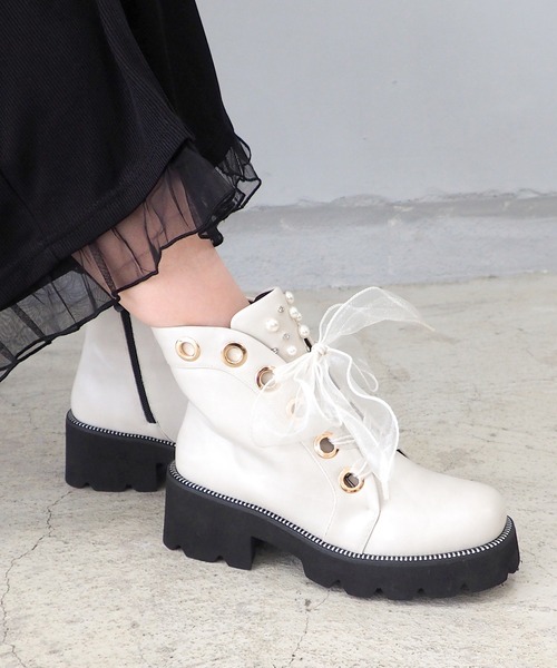 - 2025 Autumn&Winter -軽量|厚底チュールリボンブーツ デザインふわっと軽やかなチュールリボンに、パール&ビジューがきらっと光る華やかショートブーツ。ごつめのトラックソールでほんのりハードに仕上げて、甘さとのバランスが絶妙です◎フェミニンコーデにもカジュアルにも合わせやすく、足元からセンスを引き立ててくれる存在感たっぷりの一足。見た目はボリュームがあるのに、ソールは驚くほど軽くて歩きやすい!1日中動き回るライブや推し活イベントにもぴったりです。ポイント・レースアップで筒の太さを調節できる・クッションやスポンジを効かせ足あたりソフト・軽量ソールで1日履いても疲れない素材裏地:合成皮革、生地伸縮性:なしサイズ感:素材の柔らかさ:片足の重さ:約 ---gbyあしながおじさん急速に移ろっていくファッショントレンドをもっとライトな感覚でつかまえていける、そんなキャッチーな立ち位置で。“あしながおじさん”がつくってきたカジュアルシューズの楽しさをもっとたくさんのお客さまにお届けするために。Instagramアカウント:ashinagaojisan_gramINFORMATION・・・・・・・・・・・・・・[商品について]・画像の商品はサンプルです。実際の商品と仕様、加工、サイズ、素材が若干異なる場合がございます。・商品画像は、光の当たり具合やパソコンなどの閲覧環境により、実際の色味と異なって見える場合がございます。・商品の色味の目安は、商品単体の画像をご参照ください。・包装紙破損、箱破損、タグ破損につきましては商品に不良が無い場合に限り出荷させて頂いております。・厳選された素材を使用しておりますが、雨に濡れたり、汗による湿気、乾燥状態での摩擦により革が色落ちし、衣服や靴下などに色移りする可能性がございます。[返品について]・商品の性質上、ご着用後のご返品については お受けすることができません。あらかじめご了承ください。・修理依頼は、カスタマーサポートセンターお問い合わせ「ご注文に関するお問い合わせ」までご連絡ください。・・・・・・・・・・・・・・・・・・・・・・気になる商品にはぜひ「お気に入り登録♥」を [♥] アイテムをお気に入りに追加すると…完売製品の再入荷や、在庫ラスト1点などの通知を受け取ることができます![♥] ブランドをお気に入りに追加すると…新商品情報や、再入荷などブランドの最新情報をいち早く受け取ることができます!