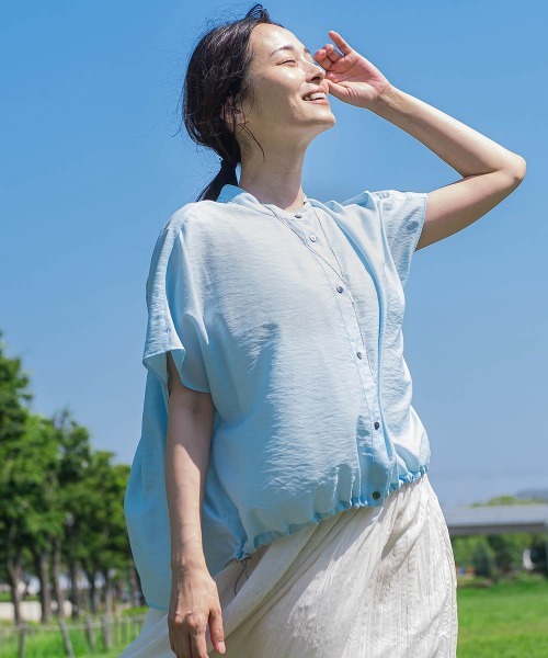【デザイン】 MY COLORシリーズのシアードロストシャツがフレンチスリーブになって登場! 一枚着としてもインせずに決まる丈バランスと羽織としても使える 前明きデザインで着回しの利くシャツになっております。 フレンチスリーブでより涼しく着ていただけます! 透けすぎない大人のシアーシャツとしておすすめアイテムになっております。 裾のドロストで絞り具合を調整していただけて内側のタブでドロストのコードを隠して キレイめに着ていただくことも可能です。 【素材】 天然繊維と合繊繊維の中間を行くハイブリッドな質感。 極細のナイロンに透明感とハリ感。 そこにナチュラルなレーヨンスパンを組み合わせることでドレープ感が加わり、 今っぽい軽やかさを表現。 ※一部カラーは素材が異なります。 アイロン時はあて布を使用。 ※同箇所に長時間あてないよう、ご注意ください。 ---------------------------------------------------------------- 洗濯方法 家庭洗濯:液温は30℃を限度とし、洗濯機で非常に弱い洗濯ができる。 自然乾燥:日陰の吊り干しがよい。 アイロン:底面温度120℃を限度としてアイロン仕上げができる。 ドライクリーニング:石油系溶剤による弱いドライクリーニングができる。 ---------------------------------------------------------------- ■モデル身長 165cm/着用サイズ 9号 ※商品タグに記載されたサイズはヌードサイズです。実際の商品のサイズは商品情報の実寸をご確認ください。 ※画像の商品はサンプルとなりますので実際の商品と仕様、加工、サイズが若干異なる場合がございます。 ※お客様のモニター環境により実際のお色と多少異なる場合がございます。 ※撮影状況や光の当たり具合により、色合いが異なって見える場合がございます。 ▼商品のお気に入り登録 ハートマークをクリックし、お好きなカラーを選んでお気に入りに登録 完売カラーの再入荷通知や、ラスト1点の通知、セールの通知も受け取ることができます。 ▼ブランドのお気に入り登録 新商品や再入荷等、いち早くブランドのお得な情報を受け取ることができます。