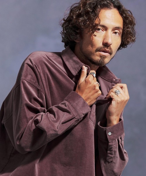 181cmのモデルがMサイズを着用。細畝のコーデュロイ生地を使用したプルオーバーシャツ。ストレッチ性あり。ゆったりとしたシルエット。※着用画像と商品単体画像で色が異なる場合がございます。※商品単体画像を実物により近づけております。