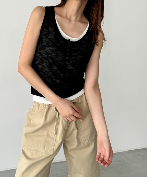 デザイン 1枚でレイヤードスタイルが完成するニットタンク。 首元はヘンリーネック仕様ですっきりとした印象に。 素材 伸縮性のある生地なので、程よく体に沿うシルエットながらもストレスなく着ていただけます。 コーディネート 重ね着要らずで、1枚でこなれた印象を与えてくれるのでこれからの季節に◎ カジュアルから綺麗めまで幅広いコーデに合わせやすい1枚です。 El mar(エルマール) El mar はスペイン語で『海』 海に向かうときはだれでもワクワクする。 洋服を選ぶとき、袖を通すとき、 同じように心が踊るアイテムを提案したい。 そんな『ワクワク』な気持ちを込めて El mar はデビューしました。 ------------------------------------- 生地の厚さ:厚い〇〇〇●〇薄い 伸縮性:あり 透け感:なし 裏地:あり 光沢:なし ------------------------------------- 【ニットのお手入れ方法について】 ニットの風合いを損なわず、きれいに保ち続けるためには日頃のケアが必要です。 1日着用して湿気がこもったニットは、風通し良い場所に干し湿気を取り2-3日お休みさせてください。 型崩れさせないようにするために畳んで保管するのがおすすめです。 ハンガーで保管の場合は、肩線が崩れないように厚みのあるハンガーや木製ハンガーをご使用ください。 【毛玉のケア方法】 毛玉取り器を使い、優しく回しながら取り除いてください。 毛玉が大きいものや毛足の長いものは、毛玉をつまみハサミでカットするのがおすすめです。 取扱い ・この素材は水や湿気に弱いため、縮んだり色落ちする場合があります。また紫外線で変色する場合もあります。 ・お洗濯は必ずドライクリーニングでお願いします。裏返しにしてクリーニングネットを使用してください。 ・スチームアイロンの使用は避け、アイロンは当て布をし、裏からアイロンをかけてください。 ・摩擦や引っ掛けにご留意ください。 ※取り扱い及びお手入れ方法については、商品についている取扱表示、洗濯表示にてご確認下さい。 ※照明の関係により、実際よりも色味が違って見える場合があります。またパソコン・スマートフォンなどの環境により、若干製品と画像のカラーが異なる場合もございます。 ※商品の色味は、商品アップ画像をご参照ください。