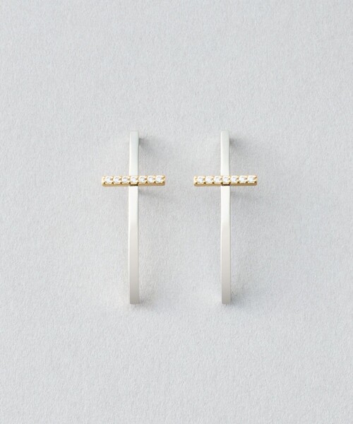 ピアスホールから上下に伸びる新鮮なシルエットの「ウェアピアス」 細身のラインが滑らかな曲線美を際立たせ、印象的な耳元を叶えます。 上品な印象のクロスモチーフに、キュービックジルコニアをアクセントとしてトッピング。 身を守ってくれるとも言われるモチーフは、お守り感覚でも身につけられそう。 存在感がありながらもベーシックなデザインで、コーディネートを問わず活躍します。 コンビカラーの配色が、より都会的な佇まいに。 クリアな煌めきが顔周りを可憐に彩り、シンプルなスタイルをブラッシュアップしてくれそう。 ※使用石(パールを含む)は素材の特性により、色や形、風合いなどが多少異なります。 予めご了承下さい。