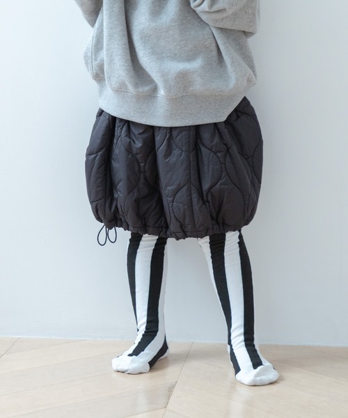 【デザイン】季節感あるキルティングのミニスカート。裾にはドロストが付いていて、絞ってバルーンデザインに変化させることもできちゃいます。中綿は軽くて保温性の高いエアサーマルを使用し、暖かく実用性もある1枚。ウエスト部分はゴム仕様で穿き心地も良く、着脱も楽ちんです。ポケットが付いているのもうれしいポイントです!