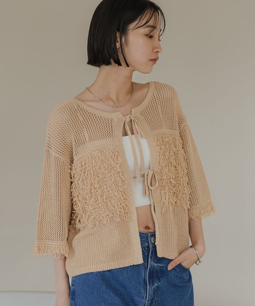 ■素材■ コットンブレンドの爽やかな素材を使用した夏に着るのにぴったりなカーディガン。 ■デザイン■ 前後着用可能な5分袖のフリンジカーディガンです。フリンジとメッシュでトレンド感満載の着映えするアイテムになっています。 ■スタイリング■ インナーにキャミやタンクを合わせて涼し気にコーディネートしていただけます。 1枚で映えるアイテムなので、ボトムははシンプルにデニム合わせがおすすめです。