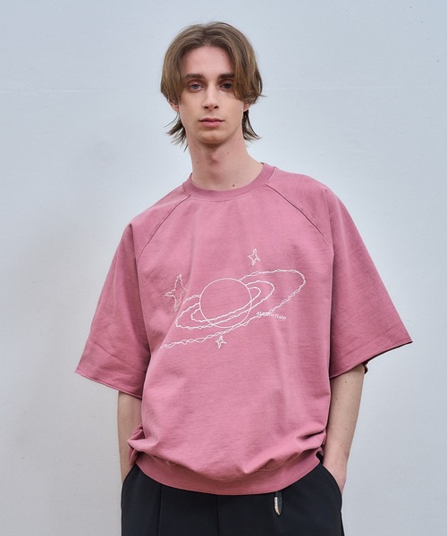 オールシーズン着用できるオリジナルグラフィックのハーフスリーブスウェット 生地にはコットン100%のミニ裏毛のボディを使用。肌離れが良く夏でも涼しく着用いただけます。 ピグメント加工を施しており程よいヴィンテージ感があります。 フロントには今シーズンのテーマでもある「universe」をイメージしたオリジナルグラフィックをプリントと刺繍を組み合わせて表現。 シルエットはやや大きめでラグランスリーブになっている為、ストレスなく着用いただけます。また背面のラグランのステッチはあえて表見せしておりさりげないアクセントになっております。 また裾リブ仕様にしている為、短丈のバランスで着用できスタイルアップ効果が生まれます。 夏は一枚着でそれ以外のシーズンはロンTEEと合わせたレイヤードスタイルがおすすめでオールシーズン楽しんでいただけるアイテムとなっております。 ※撮影環境により、光の当たり具合で色味が違って見える場合があります。あらかじめご了承下さい。