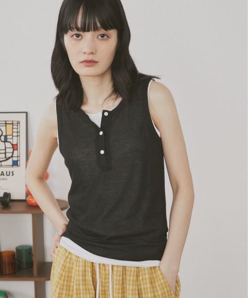 大人気のフェイクレイヤードタンクから新型が登場! ■デザイン/素材 1枚でこなれたレイヤードスタイルが完成するレイヤード風デザインのタンクトップ。 フロントはトレンドのヘンリーネックデザインを採用。 シアー感のある薄手の素材が前身頃にのみドッキングされたデザインで、着ぶくれやずれが気にならなずストレスフリーな着心地です。 ■スタイリング コンパクトなタンクトップにはワイドなシルエットのボトムスがおすすめ。 ストライプのイージーパンツと合わせて肩の力が抜けたリラックス感のあるスタイリングに。 小物とカラーを合わせた遊び心のあるスタイリングもおすすめです。 1枚でもシャツやジャケットのインナーとしても活躍する1着です。 ■カラー ブラック×ホワイト ブラウン×グリーン ネイビー×ピンク …………………… 透け感 : ややあり 厚さ:薄め 伸縮性:あり お手入れ方法:手洗い推奨 …………………… ※ご注意※ ・屋外の光や照明の当たり具合で、実際の商品の色味と カラー別画像の色味に若干の違いが発生する場合がございます。 ・詳細画像と併せてご確認の上、ご注文いただきますようお願い致します。 【MERLOT】 ジャンルレス、ジェンダーレスをテーマにヴィンテージライクからモダンなアイテムまで幅広く展開。 メンズとレディース、カジュアルとモード。あらゆる境界を取り払うミックススタイルを提案します。 【商品のお気に入り登録】 完売カラーの再入荷通知やラスト1点の通知、プライスダウンの通知を受け取ることが出来ます。 【ブランドのお気に入り登録】 新商品や再入荷など、嬉しい情報を受け取る事が出来ます。 ぜひご登録ください◎ ※ご注文いただいた予約商品のお届け時期の確認は、注文履歴ページより行えます。
