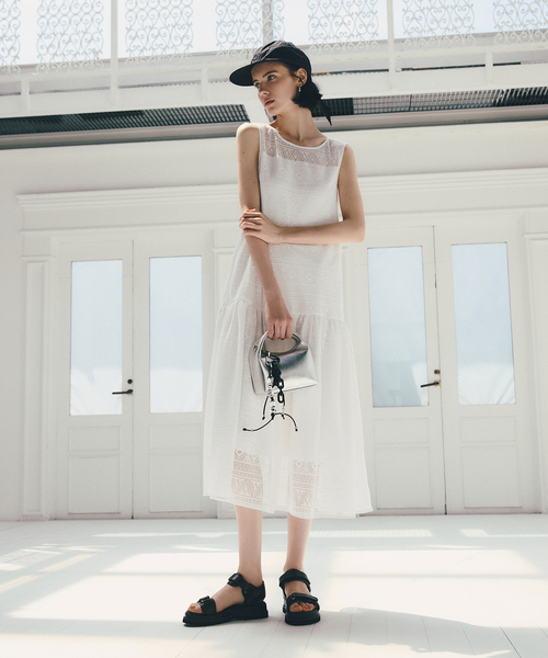 【2025AW】La Totalite幾何柄のラッセルレースを贅沢に使用したワンピース。甘すぎない柄と程よい透け感でデイリーシーンはもちろん、羽織を合わせればオフィスやきちんと見えを意識したい日にも活躍◎襟元は透けさせて涼し気な見栄えになるようなデザインにこだわりました。ご自宅でイージーケアも可能です。**********************透け感:ホワイトのみあり裏地:あり伸縮性:なし光沢感:なし生地の厚さ:普通**********************【スタッフ着用コメント】《スタッフ名:mizuki》身長:160cm/体型:普通/普段サイズ:S~M/着用サイズ:38サイズ感:やや身幅があるので肌離れが良く動きやすい。素材感:さらっとしていてしわも気にならない素材。着心地:ロング丈で生地をたっぷり使用していますが着てみると軽い着心地でした。**********************※お取り扱いについて【ブラック】着用中の摩擦や、汗、水濡れにご注意ください。濡れたままの状態で擦れると、色移りすることがあります。※取り扱いについては、商品についている品質表示でご確認ください。※照明の関係により、実際よりも色味が違って見える場合があります。またパソコン・スマートフォンなどの環境により、若干製品と画像のカラーが異なる場合もございます。※商品の色味は、商品アップ画像をご参照ください。着用モデル身長:160cm 着用サイズ:38詳細モデル身長:163cm 着用サイズ:38本体:手洗い可能