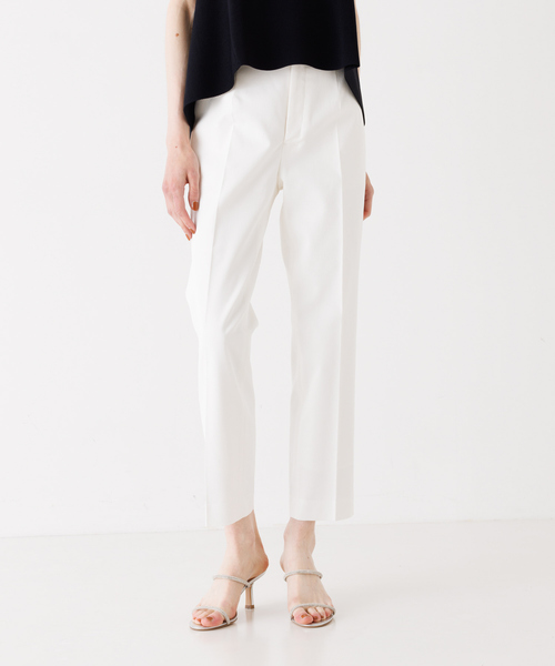 ポリエステルに天然素材のコットン、リネンを織り交ぜたドライタッチなストレッチ素材のパンツシワになりにくく、吸水速乾性、紫外線防止効果があります。細身のストレートシルエットで美脚見えも叶います。ホワイト モデル:H173 B80 W59 H85 着用サイズ:38ネイビー モデル:H177 B78 W58 H86 着用サイズ:38クリーニング方法:ドライクリーニング【注意事項】※商品画像は、光の当たり具合やパソコンなどの閲覧環境により、実際の色味と異なって見える場合がございます。あらかじめご了承ください。※画像の商品はサンプルです。実際の商品と仕様、加工が若干異なる場合があります。※サイズ表記はあくまで目安となります。※その他の予約商品、通常商品との同時決済はできません。※入荷状況により、お届け予定が前後する場合があります。※お客様への発送が店頭販売より遅れる場合もあります。※追加生産商品は、一部の店舗、通販で販売中の場合がございます。予めご了承下さい。※商品の色味の目安は、商品単体の画像をご参照ください。※商品を使用前に、タグ等に記載されている「取り扱い上の注意書き」「洗濯表示」を必ずご確認ください。※商品に不良が無い場合、包装紙および箱の彼損がございましても発送いたします。あらかじめご了承ください。