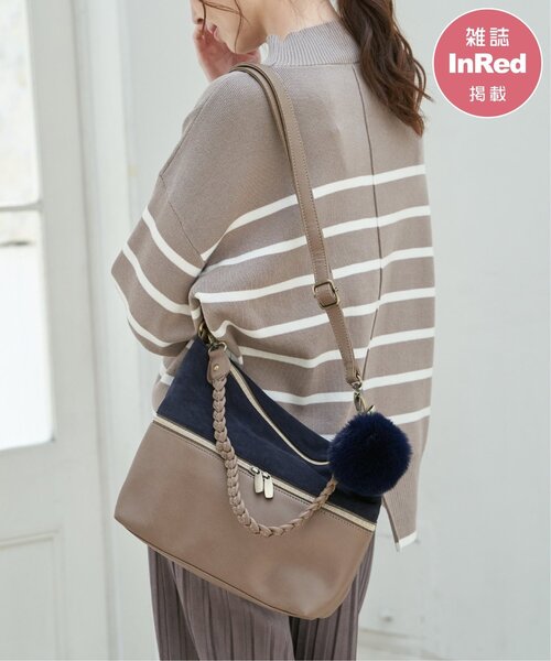 【雑誌InRed(宝島社)1月・2月合併号掲載】【雑誌InRed(宝島社)12月号掲載】ikka で定番人気となっているジップ切り替えのショルダーバッグ。両面にポケットが付いているため小物整理がしやすく、さらに肩掛けしやすいように計算された持ち手の長さでデイリーに活躍します。取り外し可能なポンポンチャーム付きで、気分に合わせたアレンジも◎週末のお出かけ用バッグとしてはもちろん、ポンポンを取り外せばきちんと感のある通勤スタイルにも対応します。【素材】スエード&合成皮革のコンビ仕様。【デザイン】中型サイズのショルダーバッグです。【ikkaポイント】・2WAY仕様・前面ファスナーポケット、側面ポケット仕様・ペットボトル収納可能・エコファーポンポン付き
