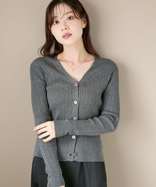 綺麗めカジュアルに使えるジャストサイズなリブカーディガン。小さなスパンコールが散りばめられたキラッとした質感がポイントの編み地で、スッキリと着られるシルエットのVネックのカーディガンに仕上げました。●ポイントベーシックなアイテムでもスパンコールのキラリとした質感で高級感と上品さもあり、いつものスタイリングを格上げしてくれます。●おすすめコーデ早めの時期からは羽織やボタンを留めて1枚着として、季節が進んでからはジャケットのインに使ってキラっとした質感をポイントにする使い方もオススメ。ベーシックカラーにプラスして発色の良いグリーンとの3色展開です。【スタッフ着用コメント】〈スタッフA〉30代前半/167cm/骨格ウェーブ/普段サイズ38‐40/着用サイズ38サイズ感:すっきり見えるジャストサイズ。素材感:スパンコールの入った生地できらりと華やかに。着用感:羽織りや一枚着でも活躍するアイテム。※取り扱いについては、商品についている洗濯表示にてご確認下さい。※照明の関係により、実際よりも色味が違って見える場合がありますまたパソコン・スマートフォンなどの環境により、若干製品と画像のカラーが異なる場合もございます。※商品の色味は、商品アップ画像をご参照ください。【注意事項】・画像の商品はサンプルです。・サイズ表記はあくまで目安となります。実際の商品と仕様、加工が若干異なる場合があります。