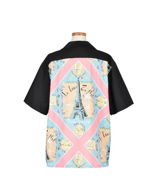 1996春夏コレクション復刻した、エッフェル塔などパリのアイコニックなモチーフを、KEITA MARUYAMAらしいテイストで仕上げた「Paris Scarf Print」 フロントと背中のヨークまでは無地、ヨーク下から裏使いしたParis Scarf Printに切り替え、大人の遊び心を漂わせた開襟シャツ。 サックスは黒の無地、ブルーはネイビーの無地との組み合わせで、ユニセックスでお召しいただけます。