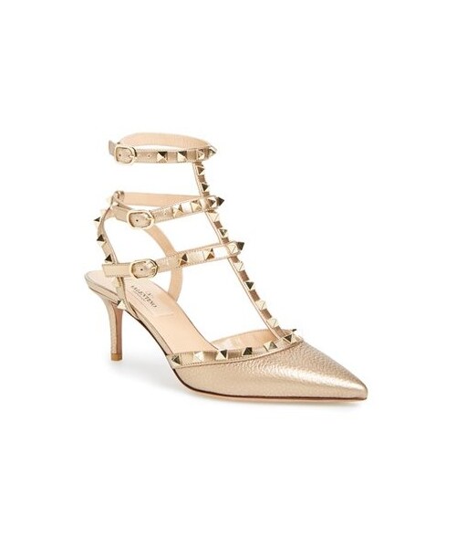 Large-grain leather in a shimmering metallic hue highlights the pointy toe and low heel of this iconic pump, while gilded pyramid studs add an extra touch of edgy opulence to the look. 2 1/2" heel. Adjustable straps with buckle closure. Leather upper, lining and sole. By Valentino; made in Italy. Salon Shoes.