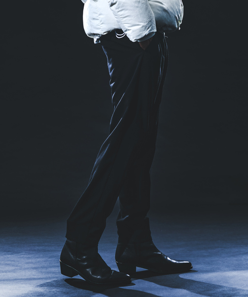 1本あると便利な新定番のテーパードイージーパンツ 【素材】ポリエステルとレーヨンストレッチの特殊混紡糸を使用した素材を使用。レーヨン特有の適度な落ち感とやわらかな風合いが特徴。 【デザイン】 素材のドレープ感と腰回りに入ったタックにより上品な印象のスリムテーパードパンツ。ウエスト部分はベルクロ仕様によりベルトレスでの着用が可能。(ウエスト一周ゴムが入っているのでジャストサイズでの設定が可能)カジュアルなコーディネートから綺麗目なコーディネートまで幅広く合わせやすいデザインのスリムパンツです。