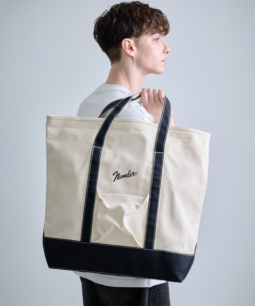 大容量収納可能なビッグキャンバストートバッグ ◇DETAIL◇ ナンバーナイン新作アイテムで、定番使いにマストなトートバッグが登場。 フロントには定番ロゴの“Number⑨”ロゴを刺繍し、その下には洋服でも採用しているマチ付きのボックスポケットを完備。 アイボリー生地はハンドルテープと底面をブラックにしたカラーと、ブラック生地に刺繍とステッチ共にオールブラックにしたモダンなカラーに、ブラック生地に刺繍とステッチをホワイトでアクセントにしたカラーの3色展開。 口部分が長い仕様で、外側に折り返してワンショルダーとしても使用可能です。 前内側には内ポケットを完備し、スマホやカードケース等の小物を収納することが可能です。 しっかりとした厚みのあるコットンキャンバス素材を使用しています。 パリッとしたハリのある素材で、荷物を入れて置くと自立するぐらいの生地感です。 キャンバスはバッグでは定番的な生地で、一年中通して使いやすい飽きのこない素材です。 A4サイズもしっかり入るかなり大きめな作りにしています。 様々なものを入れられる大容量収納可能なサイズで、小旅行などにも万能に使用できます。 無地感覚で使用できるブラック×ブラックと、配色が目に入るアイボリー、配色ステッチ刺繍がポイントのブラック×ホワイトがあるので、スタイルに合わせてカラーをチョイスいただけます。 大きめなサイズになるので、Tシャツなどシンプルなコーディネートにも映える、スタイリングのポイント使いをすることが可能です。 ※口部分には特に留め具などありませんので、横にしておいたり大きく動いた時などに物が落ちてしまう可能性もありますので、十分ご注意ください。 ※ブラック生地に関しては、引っ掻きや擦れによって白くチョークマークが出ますが、商品の雰囲気を重視した生地になりますので、不良品ではございません、予めご了承ください。 ※淡いものとの合わせで摩擦や濡れた状態で擦ったりすると、色落ち、色移りが生じる可能性がありますので、ご使用の際には十分ご注意ください。 実際の商品と仕様、加工、サイズが若干異なる場合がございます。 【NUMBER(N)INE/ナンバーナイン】 音楽に強くインスパイアされたデザインが特徴。 特にロックやパンクテイストのデザインが話題を呼び、90年代から00年代にアパレル業界で一世を風靡した。 現在はターゲットを絞らず、デニムやチェックを中心にカジュアルアパレルを展開している。