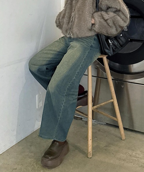 ●アソートデザイン ワイドカーブデニムパンツ(オーバーダイ・ビジュー・グラデーション)