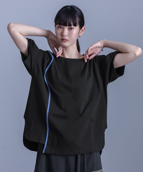 ■デザイン配色のカーブラインがアクセントになったTシャツは、さりげない個性を演出。袖にはタックを施し、立体感のあるシルエットで程よくモードな印象に。両脇のカーブスリットや脱いだときにも見える衿ぐり裏の配色など、細部までこだわったデザインが魅力です。■コーディネートアシンメトリースカートなどのデザインボトムと合わせれば、Tシャツながら存在感のある洗練されたスタイリングに仕上がります。テーパードパンツやストレートデニムと合わせれば、カジュアルながら洗練された印象に。■素材本体にはコットン100%のカットソー生地を使用。しっかりとした程よい厚みがあり、透けにくく快適な着心地を実現。肌触りも柔らかく、デイリー使いにぴったりな素材感です。