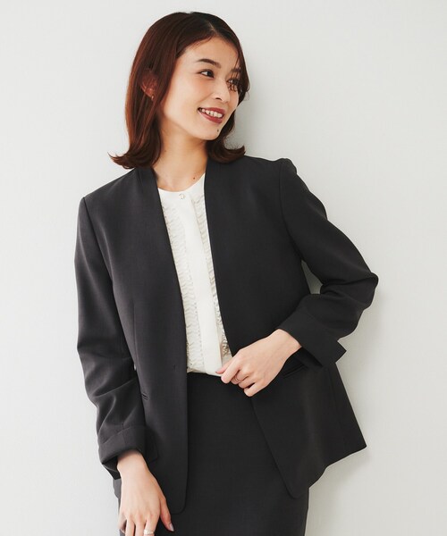 【デザイン】 ウエストが程よくシェイプした女性らしいシルエットのカラーレスジャケット。 フロントはホックの仕様でスッキリとした見え方になっています。 袖口は折り返し出来るスリットの仕様になっています。 【素材感】 ウールの長所とポリエステルの長所を融合したハイブリットな糸(トリクシオン)を使用した梳毛調合繊。 ウォータージェットという織り機で糸を織る段階で水を使い、従来のものよりも膨らみが出る機械を使用しております。 スーツ地っぽいのにジャージのような着心地と、キックバックの良いストレッチ性と反撥性が特徴です。 更に仕上げに特殊な加工を施し、マスクメロンのような表情の細かいシワと少し天日干し調のシワをミックスして仕上げております。 綺麗めなのにかっちりしすぎない、でもカジュアルすぎない少しリラックス感もある新感覚の素材となっております。 UVカット・接触冷感の嬉しい多機能付き素材です。 【着こなしポイント】 しわにもなりにくく、お取り扱いしやすい素材で長いシーズンで着用いただけます。 ライトウェイトテーパードパンツ(商品番号:153-63100)、タイトスカート(商品番号:153-73100)とのセットアップです。 【仕様】 ・ポケット数:横×2 内側×1 ・裏地:背抜き仕立て ※この製品は、太陽光線中の紫外線(UV)を通しにくくします。この効果は永久的ではありません。 ※照明の関係により、実際よりも色味が違って見える場合があります。また、パソコン・スマートフォンなどの環境により、若干製品と画像のカラーが異なる場合もございます。 モデル情報:身長161cm B79 W58 H86 着用サイズ:02(M) 店舗へのお問い合わせ商品番号:153-43101 ●製品寸法: 00(XS):着丈57cm B86cm 袖丈55cm 肩幅37cm 01(S):着丈59cm B89cm 袖丈57cm 肩幅38cm 02(M):着丈60cm B93cm 袖丈58cm 肩幅39cm 03(L):着丈61cm B96cm 袖丈59cm 肩幅40cm 04(2LT):着丈62cm B99cm 袖丈60cm 肩幅41cm 42(2L):着丈62cm B103cm 袖丈57cm 肩幅42cm 44(3L):着丈63cm B107cm 袖丈58cm 肩幅43cm 46(4L):着丈64cm B111cm 袖丈58cm 肩幅43cm 48(5L):着丈65cm B115cm 袖丈59cm 肩幅44cm 50(6L):着丈66cm B119cm 袖丈59cm 肩幅44cm 備考:重量:約295g(サンプルサイズ)