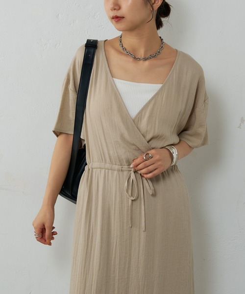 【一枚でサマ見え。リネンライクカシュクールワンピース】リネンのような風合いで、涼しげでナチュラルな印象を与えるこなれワンピースが登場。まるでリネンのようなナチュラルな風合いを持ちながら、レーヨンとナイロンの混紡素材でしなやかで上品見えに。さらりとした肌触りなので、これからの季節に快適に過ごせるのも嬉しいポイント◎深めのカシュクールデザインは、デコルテを美しく見せ女性らしさを引き立て、アクセサリーとの相性も抜群です。ウエストのリボンを結べばメリハリのあるシルエットが完成し、スタイルアップ効果も期待できます。デザインの邪魔をしないサイドのラインにポケットがついているので、スッキリとしたシルエットです。一枚でコーディネートが完成するワンピースはデイリーユースだけではなく、リゾートや夏の旅行にもおすすめ。アクセサリーやバッグでアレンジすれば、オフィスから休日のお出かけまで幅広いシーンで活躍まちがいなしの1着。【商品ポイント】・ポケット付き・涼しげでナチュラルな印象のリネンライク素材・デコルテを美しく見せるカシュクールデザイン・一枚でコーディネートが完成・さらりとした肌触りで快適な着心地・ウエストリボンデザインでスタイルアップ効果抜群【リネンライクシリーズ】CWA1052102A0002 リネンライクイージーパンツCWA1052104A0003 リネンライクキャミブラウスCWA1052104A0004 リネンライクプルオーバー----------------------------------------------------■商品特徴洗 濯 方 法 :手洗い可裏 地 :あり透 け 感 :なし伸 縮 性 :なし光 沢 感 :なし生地の厚さ:うすめ----------------------------------------------------■素材本体: レーヨン80%, ナイロン20%裏地: ポリエステル100%----------------------------------------------------※着用、お取り扱いの際は、商品についている品質表示とアテンションタグを必ずご確認下さい。※商品タグに記載されている商品名がWEBでの表記名と異なる場合があります。※実際の商品と仕様、加工、サイズが若干異なる場合がございます。※照明の関係により、実際よりもやや明るく見える場合がございます。またパソコンなどの環境により、若干製品と画像のカラーが異なる場合もございます。予めご了承くださいませ。【お気に入り登録】してお得な情報をCHECK!!・「商品のお気に入り登録」で再入荷通知や、ラストの通知、セール通知も受け取ることができます。・「ブランドのお気に入り登録」で新商品や再入荷など、お得な情報を受け取ることができます。