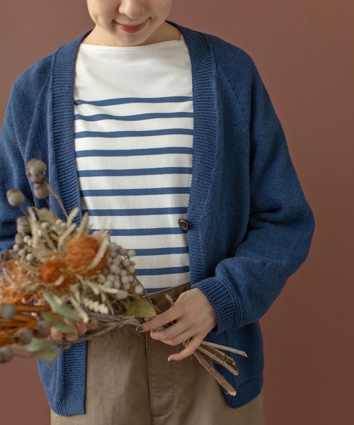 一つボタンが軽やかな印象の、やわらかい肌触りのVネックカーディガン。 シルク糸を作る過程で生まれる落ち綿や短繊維を再利用したノイルシルクと、リサイクルコットンを混紡した糸で編み上げました。ノイルシルクは不揃いな繊維や節があり、コットンのように普段使いしやすいカジュアルな素材。甘撚り糸で織った生地はやわらかい風合いで空気を含み、保温性・吸湿性に優れているので、夏の日除けや秋口の肌寒い時期にも使い勝手の良いアイテムです。ニットを丸ごと編み上げるホールガーメント製法で、肩や脇部分に接ぎ目がなく、ストレスフリーに着られるのも嬉しいポイント。メンズライクな深めのVネックカーディガンはボタンを閉じて着ても、インナーがちらっと覗いて抜け感のあるスタイリングに。前立てや袖口など部分的にガーター編みで切り替えを作り、くるんとしたポケット口やラグランディテールで立体感のあるデザインに仕上げました。 さらっとシンプルな無地カットソーに合わせてもさまになる一着。シワになりにくい素材なので、コンパクトに折り畳んで持ち運びにもぴったりです。 -------------------- 透け感:なし 裏地:なし 伸縮性:あり 光沢感:なし ポケット:あり -------------------- 【素材の特性・お取り扱いの注意】 ・取り扱いの注意については取り扱い表示をよくご確認の上、着用をお願い致します。 ・洗濯の際に多少の縮みがあります。単独洗いを行い、速やかに脱水・乾燥させて下さい。型くずれ防止の為、洗濯後は形を整えてから日陰で平干しして下さい。 ・ハンガーに掛けたまま保管すると伸びますので、避けて下さい。 ・素材の特性上、汗や雨などで濡れた時や摩擦が生じた場合に色落ちし、他の衣料に移染する事があります。特に白いバッグや白いインナー、ボトムなど、摩擦によって色移りしますので、コーディネートには十分ご注意下さい。 ※撮影画像は、光の当たり具合やモニターの環境により色味が違って見える場合があります。あらかじめご了承下さい。 ※レッドとネイビーの画像はサンプルを着用しています。お届けする実際の商品と仕様、加工、サイズが若干異なる場合がございます。 レッドのサンプルから襟ぐりがそれぞれ左右で1cmずつ内側に詰まります。ネイビーのサンプルの画像から身幅が一周で3cm大きく、ゆき丈が3.5cm長く、ラグランのカーブが緩くなります。正しくはレッドの画像をご覧下さい。