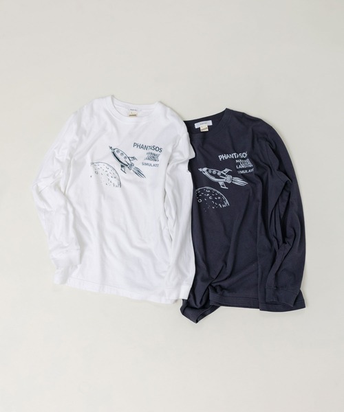 “架空の宇宙プログラム”のグラフィックをプリントしたカットソー。SCREEN STARSの5.6オンスのコットン100%ボディを使用。一枚で着用できる程良い厚みと強度を兼ね揃え、洗濯を繰り返してもよれにくい作りです。縫い上がった製品を一度洗いにかける製品水洗い加工を加え、味のある風合いに仕上げました。ゆったりとしたサイズ感で気軽に日常使いしやすいところも嬉しい。よく見るとユニークな丸い窓の宇宙船や月のクレーターなど、メンズのデザインにありそうなアートワークをプリントしました。宇宙船“PHANTASOS”の船名の由来は、ギリシャ神話に登場する夢の神様の名前から。イラストのサイドに記された“有人月面着陸”“模擬実験をする”という意味のフレーズで、想像しただけでわくわくした気持ちになりそう。イラストと文字の配置間隔や、プリントの大きさは微調整を重ね、一枚で着た時にもスタイリングの主役になるアイテムに仕上げました。プリントで遊び心を効かせた分、ベースカラーはホワイトとネイビーのベーシックカラーをチョイス。ホワイトボディには紺、ネイビーボディには白のかすれプリントを単色で施し、どこか古着のような雰囲気に。カーディガンや前開きベストのインナーとしてプリントを覗かせるのもおすすめ。--------------------透け感:なし裏地:なし伸縮性:ややあり光沢感:なしポケット:なし--------------------【素材の特性・お取り扱いの注意】・取り扱いの注意については取り扱い表示をよくご確認の上、着用をお願い致します。・プリント部分へのアイロンは避けて下さい。洗濯、摩擦により、多少変色や色落ちする場合がありますので、予めご了承下さい。着用や洗濯を繰り返すことにより、プリントのひび割れや剥離が生じる事があります。・(ネイビー)汗や雨などで濡れた場合、摩擦により色落ちし、他の衣料に移染する事がありますのでご注意下さい。※撮影画像は、光の当たり具合やモニターの環境により色味が違って見える場合があります。あらかじめご了承下さい。※ホワイトとネイビーの画像はサンプルを着用しています。お届けする実際の商品と仕様、加工、サイズが若干異なる場合がございます。